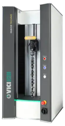 This is an example of a Cylindrical Coordinate Measuring Machine (CCMM), a special type of CMM that uses a rotating table to move the part relative to the inspection probe. In this case the CCMM is a camera and telecentric lens system, which is fitted with a tactile probe.