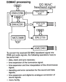 D2-MAC is a satellite television transmission standard, a member of Multiplexed Analogue Components family.[1][2] It was created to solve D-MAC's bandwidth usage by further reducing it, allowing usage of the system on cable and satellite broadcast.[3][4] It could carry four high quality (15 kHz bandwidth) sound channels[5] or eight lower quality audio channels.[6] It was adopted by Scandinavian, German and French satellite broadcasts (CNBC Europe, TV3 (Sweden), TV3 (Denmark), EuroSport, NRK 1, TV-Sat 2, TDF 1, TDF 2, etc).[7][8][4][9][10][11] The system was used until July 2006 in Scandinavia and until the mid-1990s for German and French sound channels.