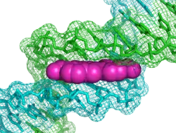 DAPI (magenta) bound to the minor groove of DNA (green and blue). From PDB: 1D30.