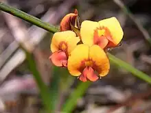 Daviesia alata is a species of flowering plant in the family Fabaceae and is endemic to south-eastern New South Wales. It is a prostrate to low-lying shrub with winged branchlets that are triangular in cross-section, phyllodes reduced to scales, and orange, red, yellow and maroon flowers.