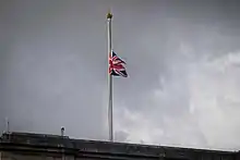 After the announcement, the Union flags at Buckingham Palace and 10 Downing Street were lowered to half-mast.[50][51] At Balmoral Castle, the Royal Standard of the United Kingdom was lowered and then, because the new king was present, was raised again. The Royal Banner of Scotland was lowered to half-mast at the Palace of Holyroodhouse, as was the Welsh flag at Cardiff Castle.[51][52] Crowds gathered outside royal residences. [53]