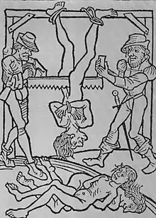 Sawing of three men, from a 15th-century print[1]