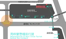 Lai Wai-kit, a firefighter who administered first aid to Chow, revealed that anti-government protesters had unintentionally delayed their arrival by blocking a road leading to Chow's location.[38] News footage played in court showed that two fire engines could not reach the car park due to a roadblock at the junction of Tong Ming Street and Tong Chun Street.[38] Lai declared that his fire engine had to make a U-turn because the road to the car park was obstructed with various objects.[38] A large number of protesters had gathered at that position, but that there had been unintentional obstruction to firefighters.[38]