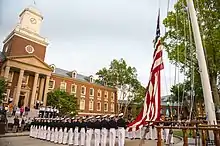 Defense of the Cutter Eagle is one panel in a larger mural depicting the Revenue Marine and Coast Guard's battles displayed inside Hamilton Hall at the United States Coast Guard Academy.[4] It is one of two paintings commissioned by the Coast Guard of the battle, neither of which are considered accurate, the mural showing an unrealistic representation of the geography of Negro Head and the other work omitting the presence of the Connecticut soldiers.[1]