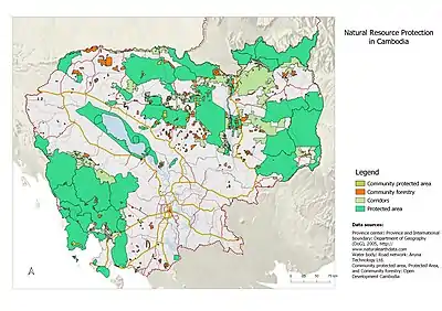 The first protected area was established in 1998 under the reign of King Sihanouk. However, the law on protected areas was adopted in 2008 to govern biodiversity and ensure the sustainability of natural resource within the protected areas.[31] This law recognized the rights of indigenous communities and the general public to participate in decision making on managing and conserving biodiversity in a sustainable approach. Community protected areas (CPA) is a mechanism to engage the local community including indigenous people, who are the primary natural resource users, in planning, monitoring and decision making on protected area management. As of 2018, the number of community protected areas has increased to 153 communities within 51 protected areas.[3]