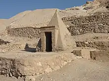 The first datable remains of the village belong to the reign of Thutmose I (c. 1506–1493 BCE) with its final shape being formed during the Ramesside Period.[15] At its peak, the community contained around sixty-eight houses spread over a total area of 5,600 m2 with a narrow road running the length of the village.[16] The main road through the village may have been covered to shelter the villagers from the intense glare and heat of the sun.[5] The size of the habitations varied, with an average floor space of 70 m2, but the same construction methods were used throughout the village. Walls were made of mudbrick, built on top of stone foundations. Mud was applied to the walls, which were then painted white on the external surfaces, while some of the inner surfaces were whitewashed up to a height of around one metre. A wooden front door might have carried the occupants' name.[17] Houses consisted of four to five rooms, comprising an entrance, main room, two smaller rooms, kitchen with cellar and staircase leading to the roof. The full glare of the sun was avoided by situating the windows high up on the walls.[1] The main room contained a mudbrick platform with steps which may have been used as a shrine or a birthing bed.[1] Nearly all houses contained niches for statues and small altars.[18] The tombs built by the community for their own use include small rock-cut chapels and substructures adorned with small pyramids.[19]