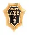 - Membership pin: "The official plain or pearl badge was a gold pin, shield shaped, having seven points, the edge being of pearls or of gold. ΔΣΕ, the friendship circle, the cornucopia, and the secret motto in gold on a black background."