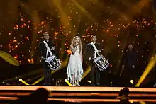 The Danish performance featured Emmelie de Forest in a cream coloured loose tank dress designed by Danish designer Anja Elefteria and performing with two drummers, one of them who also played the penny whistle, and three backing vocalists. The stage colours were predominantly red, yellow and orange and the performance also featured a pyrotechnic fountain effect.[23][24][25] The two drummers that joined Emmelie de Forest were Jacob Baagøe Thomsen and Morten Specht Larsen, while the three backing vocalists were: Anne Murillo, Heidi Degn and Anders Øhrstrøm.[26]