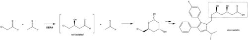 DERA has also been used to perform tandem aldol reactions with three aldehyde substrates, with reaction equilibrium driven by the formation of the six-membered cyclic hemiacetal.[10] This intermediate has been used in the synthesis of statin drugs, such as atorvastatin,[11] rosuvastatin and mevastatin.[12]