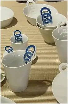 An iconic example used by Professor Masuda and Architect Johnson to illustrate the historical precedent for “Design with Memory” is the ancient Japanese tea cup which has been broken and visibly repaired (also see kintsugi, wabi-sabi).[2] "An 'old' value in eco design can be seen in an ancient Japanese tea ceremony cup that was broken and carefully repaired. This care and attention gives the cup added value as it becomes a cultural icon.”[12]