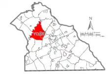 Detters Mill was along the border of Dover Township (shown in red) and Warrington Township in rural northwestern York County, Pennsylvania.