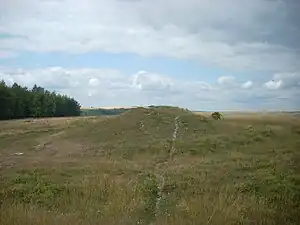 The Devil's Jumps are a group of five large bell barrows situated on the South Downs 1.2 kilometres (0.75 mi) south-east of Treyford in the county of West Sussex in southern England.[1] The Devil's Jumps site is listed as a Scheduled Ancient Monument and as a Local Nature Reserve.[2] Most barrows along the South Downs have been damaged by agriculture and treasure hunters but the Devil's Jumps are considered to be the best preserved Bronze Age barrow group in Sussex.[3] The barrows are laid out in a line running approximately south-east to north-west.[4] The five barrows vary in diameter from 26 to 34 metres (85 to 112 ft) and stand up to 4.8 metres (16 ft) high.[5] Two smaller barrows were situated close to the five main mounds.[6] Traces remain of a sixth barrow.[7] The Devil's Jumps have been dated to the Bronze Age and they are believed to be between three and four thousand years old.[8] The Devil's Jumps were explored in the 19th century, when bones were found in two of the mounds,[9] although some of the barrows contained no cremated remains at all.[10] The main line of five barrows is aligned with sunset on Midsummer Day.[11]