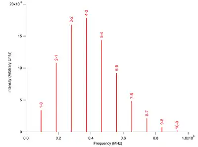 By fitting all observed bands, the rotational constants for N2H+ were determined to be Be = 1.561928 cm−1 and De = 2.746×10−6 cm−1, which are the only constants needed to determine the rotational spectrum of this linear molecule in the ground vibrational state, with the exception of determining hyperfine splitting. Given the selection rule ΔJ = ±1, the calculated rotational energy levels, along with their percent population at 30 kelvins, can be plotted. The frequencies of the peaks predicted by this method differ from those observed in the laboratory by at most 700 kHz.