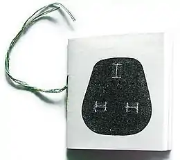The first edition of Die-Cut Plug Wiring Diagram Book is a small softback book containing 36 photocopied plug wiring diagrams, mostly in colour using different coloured toners in monochrome photocopiers; 3 full colour photocopies have been tipped in as well. The 'de-luxe version' of the book is sewn together using different coloured threads that mimic electrical wiring, whilst the ordinary edition is stapled. The 'de-luxe' version sold for £3.00, twice the asking price of the stapled version.[9] The cover is a grainy photocopy of the back of a plug diagram with three holes cut into it (where the pins would go). There is a brief essay at the end by Pawson discussing his collection of plugs, and their essential Britishness.[10][11] The last page lists credits of 'contributing electricians'.