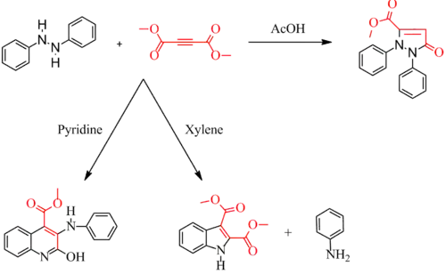 The Diels–Reese Reaction is a reaction between hydrazobenzene and dimethyl acetylenedicarboxylate (or related esters) first reported in 1934 by Otto Diels and Johannes Reese.[1][2] Later work by others extended the reaction scope to include substituted hydrazobenzenes.[3] The exact mechanism is not known. By changing the acidic or basic nature of the solvent, the reaction gives different products. With acetic acid as solvent (acidic), the reaction gives an diphenylpyrazolone. With xylene as solvent (neutral), the reaction gives an indole. With pyridine as solvent (basic), the reaction gives a carbomethoxyquinoline which can be degraded to a dihydroquinoline.