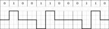 In digital communications, a digital signal is a continuous-time physical signal, alternating between a discrete number of waveforms,[3] representing a bitstream. The shape of the waveform depends the transmission scheme, which may be either a line coding scheme allowing baseband transmission; or a digital modulation scheme, allowing passband transmission over long wires or over a limited radio frequency band. Such a carrier-modulated sine wave is considered a digital signal in literature on digital communications and data transmission,[11] but considered as a bit stream converted to an analog signal in electronics and computer networking.[12]