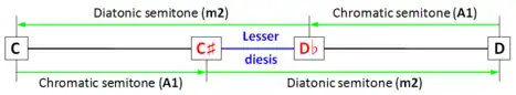 - ↑ Haluska, Jan (2003). The Mathematical Theory of Tone Systems, p. xxvi. ISBN 0-8247-4714-3. Minor diesis, diminished second.