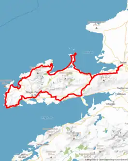 The trail begins in Tralee, following the towpath of the Tralee Ship Canal to Blennerville, after which it follows the road for a while before climbing up to a mountain track along the northern flanks of the Slieve Mish Mountains. From here it descends towards Tralee Bay and the village of Camp.[6] The next few stages – Camp to Annascaul, via Inch Strand; Annascaul to Dingle, via Lispole; and Dingle to Dunquin, via Ventry – mainly follow minor roads and boreens.[7] The latter section of the stage between Dingle and Dunquin follows a cliff path around Slea Head.[8] The section between Dunquin and Ballycurrane follows a mixture of roads, beaches and cliff paths.[9] The most mountainous stretch of the Way now follows as the trail ascends a saddle between Brandon and Masatiompan mountains.[10] At 640 metres (2,100 feet), this is the highest point reached by any of the National Waymarked Trails in Ireland.[11] The Way then descends to Brandon village and follows a trail to the village of Cloghane.[12] From Cloghane, the trail follows Fermoyle Strand, Ireland's longest beach, to Fahamore, before following roads to the village of Castlegregory.[13] The final stage follows the coastline to Camp before retracing the outward route to Tralee.[14]