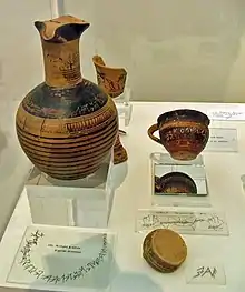 ![]() Dipylon oenochoe (left), on display in the National Archaeological Museum, Athens. The inscription is scratched into the dark band around the shoulder of the vase. | |