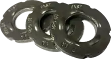 DTIs within the RCSC specification section 8.2.4 are described thus: "ASTM F959 direct tension indicators are recognized in this Specification as a bolt-tension-indicating device. Direct tension indicators are hardened washer shaped devices incorporating small arch-like protrusions on the bearing surface that are designed to deform in a controlled manner when subjected to compressive load."[4]