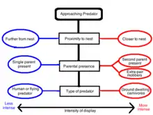 Several considerations involving the predator have been shown to be important, including the distance of the predator from the nest. Intensity of display has been shown to decrease as the distance of the predator from the nest increases, perhaps representing the balancing of risk to the displaying parent and to the vulnerable young.[25] The type of predator has also been shown to be of importance,[17] with birds tending to display most intensely to ground-dwelling carnivores and less intensely to humans and flying predators.[13][22][33] Finally, the number of potential predators has also been shown to be important in sticklebacks, in which frequency of distraction displaying by the male is positively correlated with the number of conspecifics in a foraging shoal.[8]