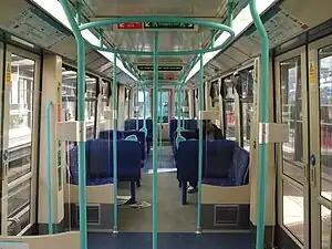 The first three generations of passenger trains consist of 149 high-floor, bi-directional, single-articulated cars, each 28 metres (91 feet 10 inches) long. The cars have four doors on each side (2 per section). When the system was first built, trains sometimes consisted only of a single unit, but now each train is normally composed of two cars coupled together. A third car has been added on the busiest routes since 2010.[8][9][10] Each car has 70 seats and has a total capacity of 284 passengers.[11] The future B23 rolling stock will instead move to a single 5-section unit the length of a 3-car train, with 13 doors per side