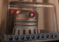 The first 100 games included a moving Dalek topper that would turn side-to-side while the robot was speaking.[1] The effect was achieved by fitting the robot's body with a complex motor, cam, and optoelectronics system. Its complexity and expense led to it being cut from the production run.[2] Production Dalek toppers can be made to move with "wobble head kits".[3]