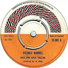"Double Barrel" is a 1970 reggae single by Dave and Ansell Collins (though credited in both the UK and the U.S. to 'Dave and Ansil Collins'). It was the second reggae tune to top the UK charts, two years after Desmond Dekker's number 1 breakthrough hit "Israelites".[4] The record reached number 1 on the UK Singles Chart[5] for the first two weeks in May 1971, selling 300,000 copies, after only 33 radio plays.[6] In the U.S., "Double Barrel" peaked at number 22 on the Billboard Hot 100 the week of 7 August 1971[7][8] and number 4 on WLS on 28 June 1971,[9] two years to the week after "Israelites" made a nearly identical climb to peak at the same position on the same chart.[10] The record also reached number 1 in Mexico on October 23, 1971[11] and number 8 in Australia.[12]