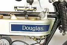 From 1907 a 350 cc Douglas version was on sale, similar to the Fairy with the engine in-line mounted high in the frame, but without the chain driven countershaft beneath, and with belt final drive. At the 1907 Stanley Show they attracted a lot of attention with a V4 engined motorcycle, with automatic inlet valves, and 2-speed drive.[5] The V4 was not to go into production and by the 1908 show it was only the updated in-line twin that was on show, now lighter and with a lower engine position.[6] Around 1911 the frame was modified to make the engine still lower, and in 1912 the automatic inlet valves were replaced by mechanically operated valves.[7]
