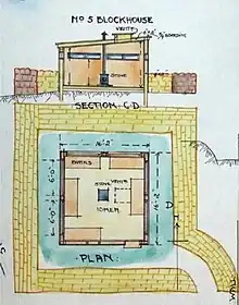 The battery was further defended by an outer perimeter of six blockhouses positioned between 250 and 400m from the battery. The blockhouses were built of wood with pitched wood and felt roofs, internally there was a stove and bunks for 10 men. The blockhouses were made bulletproof with the addition of a sandbag wall placed approximately one metre away from the wooden structure.[2][3]