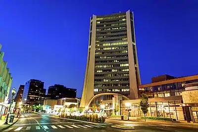 Many of the most distinctive buildings in Downtown Stamford were designed by the late Victor Bisharat, a Jordanian who received his education at the American University in Beirut, Lebanon and at the University of California at Berkeley. His Stamford buildings were designed for F.D. Rich Co.[12] (For information on Bisharat's buildings on High Ridge Road, see Arts and culture in Stamford, Connecticut.)