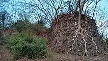 The path to the Dronagiri fort starts from the Uran Bus stand. The narrow road in front of the Bus stand leads to Daur Nagar. After passing through the tribal hutments in Daur nagar a lone path leads to the fort. The path is a gradually climbing northern detour around the hill. The entire path passes through dense forest of Gliricidia sepium or Mexican Lilac trees planted by Forest department.[3] There is a Police Chowki near the Church on the fort. Night halt on the fort is restricted.