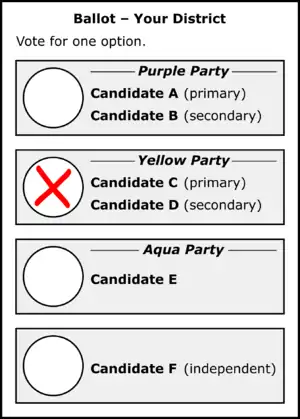 Similar to FPTP, a voter selects one option on the ballot. The distinguishing feature of a DMP ballot is that parties may list two candidates. If a party nominates two candidates, a vote for the party initially supports the primary candidate. The secondary candidate is only considered if the primary candidate has won the district's first seat; in this case, the party's district votes are transferred to the secondary candidate at half their value. This gives the secondary candidate a chance to be elected as well, but the 50% weighting makes it challenging for a party to win both seats in a single district. In a typical district, the primary candidates of two different parties will be elected.