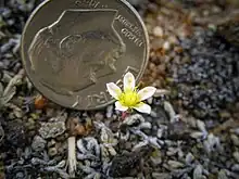 The flowers are white and star-shaped, with a yellow center. The petals are connate 0.7 mm (0.028 in), and spread from near the middle. They are white, colored pinkish on the keel, turning yellow towards the center, and are also often lined with red. The shape of the petals is elliptic, and they measure 5–8.5 mm (0.20–0.33 in) long by 2–3.5 mm (0.079–0.138 in) wide, with the apex subobtuse. The entire corolla measures 8–15 mm (0.31–0.59 in) in diameter. The flowers tend to have a musky-sweet odor.[7]