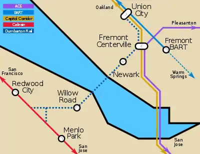 From Union City, trains would stop at stations in Fremont (Fremont Centerville Station), Newark and Menlo Park/East Palo Alto before joining the main Caltrain line at Redwood City (northbound) or Menlo Park (southbound), with limited service to San Francisco or San Jose, respectively. Two more stations could be added in Redwood City (2nd Avenue) and Hayward (Hayward BART) if rider participation would justify the cost.[1][3]
