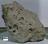 | 15499 | ![]() | basalt | Blocky, angular, highly vesicular basalt. Vesicles appear to grade in size and abundance across the rock. One surface is coated by light yellowish-gray material grading into very dark brownish-gray coating at one edge. The rock is porphyritic with brown pyroxene prisms to 10 mm long in a groundmass of plagioclase laths and pyroxene. |