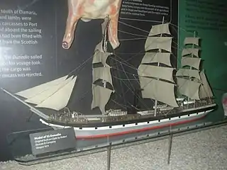 The Dunedin ⓘ (1876–90) was the first ship to successfully transport a full cargo of refrigerated meat from New Zealand to England. In this capacity, it provided the impetus to develop the capacity of New Zealand as a major provider of agricultural exports, notwithstanding its remoteness from most markets. Dunedin disappeared at sea in 1890, and neither the ship nor her crew has ever been seen or heard from since.
