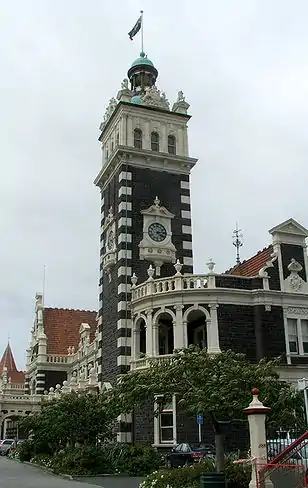 In an eclectic, revived Flemish renaissance style, (Renaissance Revival architecture), the station is constructed of dark basalt from Kokonga in the Strath-Taieri with lighter Oamaru stone facings, giving it the distinctive light and dark pattern common to many of the grander buildings of Dunedin and Christchurch. Pink granite[3] was used for a series of supporting pillars which line a colonnade at the front. The roof was tiled in terracotta shingles from Marseilles[4] surmounted by copper-domed cupolas.[5] The southern end is dominated by the 37-metre clocktower visible from much of central Dunedin.
