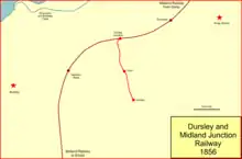 The Dursley and Midland Junction Railway was a company formed to build a railway branch line to connect the town of Dursley in Gloucestershire, England, to the nearby main line between Bristol and Gloucester, at Coaley. The line was opened in 1856, but was immediately loss-making, and the company soon had to sell its line to the Midland Railway.