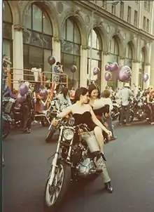 The term "Dykes on Bikes" was coined at the first gathering of the 1976 San Francisco Pride parade.[11] The connection between lesbians and motorcycles, however, existed before this official naming. Motorcycles have regularly appeared in lesbian fiction,[3] and the term is sometimes used derogatorily against any woman rider who isn't with a man.[12]