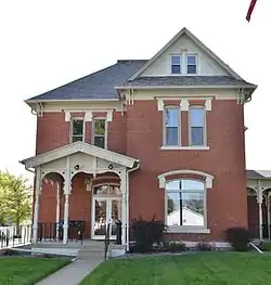 The E.R. Hays House, also known as Bybee & Davis Funeral Home, is a historic building located in Knoxville, Iowa, United States. Hays was a local lawyer who served briefly in the United States House of Representatives, replacing Edwin H. Conger who resigned to become the United States Ambassador to Brazil.[2] Hays died a year after the house was completed. The family continued to live here until 1935 when it became the Bybee & Davis Funeral Home. The 2½-story brick structure was designed by the Des Moines architectural firm of Foster & Liebbe in a combination of the Late Victorian and Italianate styles. Victorian eclecticism is featured in the porch and the trimwork, while the Italianate is found in the building's massing. The house was listed on the National Register of Historic Places in 1984.[1]