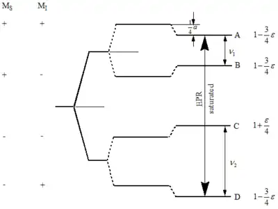 The right figure illustrates the energy diagram of the simplest spin system where a is the isotropic hyperfine coupling constant in hertz (Hz). This diagram indicates the electron Zeeman, nuclear Zeeman and hyperfine splittings. In a steady state ENDOR experiment, an EPR transition (A, D), called the observer, is partly saturated by microwave radiation of amplitude while a driving radio frequency (rf) field of amplitude , called the pump, induces nuclear transitions.[5] Transitions happen at frequencies and and obey the NMR selection rules and . It is these NMR transitions that are detected by ENDOR via the intensity changes to the simultaneously irradiated EPR transition. It is important to realize that both the hyperfine coupling constant (a) and the nuclear Larmor frequencies () are determined when using the ENDOR method.[6]