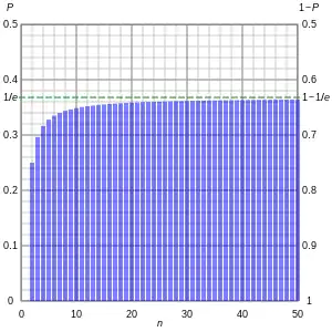 Another application of e, also discovered in part by Jacob Bernoulli along with Pierre Remond de Montmort, is in the problem of derangements, also known as the hat check problem:[23] n guests are invited to a party and, at the door, the guests all check their hats with the butler, who in turn places the hats into n boxes, each labelled with the name of one guest. But the butler has not asked the identities of the guests, and so puts the hats into boxes selected at random. The problem of de Montmort is to find the probability that none of the hats gets put into the right box. This probability, denoted by , is: