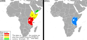 The East African shilling was the sterling unit of account in British-controlled areas of East Africa from 1921 until 1969.[1] It was issued by the East African Currency Board. It is also the proposed name for a common currency that the East African Community plans to introduce.