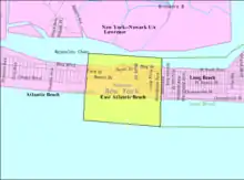 East Atlantic Beach is located at 40°35′17″N 73°42′21″W / 40.58806°N 73.70583°W (40.588004, -73.705925).[2] The hamlet is one of five municipalities located on Long Beach Barrier Island, a barrier island lying just south of Long Island. It is surrounded by the Atlantic Ocean to the south, Reynolds Channel on the north, the village of Atlantic Beach to the west, and the city of Long Beach to the east.
