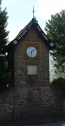 An interesting and unusual clock can be seen in the centre of the village. It was a gift of Mr W.W. Kettlewell, and was erected in 1897 to commemorate the 60-year reign of Her Majesty Queen Victoria. Squared, irregular coursed rock-faced sandstone with stone dressings, plain tile roof and wooden bargeboards. Commemoration tablet beneath circular clock face set in chamfered stone surround with the inscription: 'TIME FLIES DONT DELAY' - each word in separate spandrels. Bargeboarded gable and has the wording 'HEAVEN'S LIGHT OUR GUIDE'. Set in prominent position at street junction. A Grade II listed building.[11]
