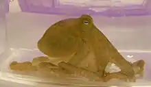 Octopus rubescens (commonly the East Pacific red octopus, also known as the ruby octopus, a preferred common name due to the abundance of octopus species colloquially known as red octopus[1]) is the most commonly occurring shallow-water octopus on much of the North American West Coast and a ubiquitous benthic predator in these habitats.[2] Its range extends from the southern Gulf of California to at least the Gulf of Alaska, but may also occur in the western Pacific Ocean. O. rubescens occurs intertidally to a depth of 300 m (980 ft).[3]