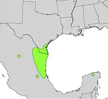The range of E. ebano stretches from Laredo and Corpus Christi, Texas[5] south through the states of Tamaulipas, Nuevo León, San Luis Potosí, Veracruz, Campeche, and Yucatán in Mexico.[6] It can be found in the Tamaulipan matorral,[7] Tamaulipan mezquital,[8] Veracruz dry forests, and Yucatán dry forests ecoregions.[9] Its habitat extends from sea level to 1,000 m (3,300 ft), averages 20 to 27 °C (68 to 81 °F) in temperature, and receives a mean of 900 mm (35 in) of annual rainfall.[6]