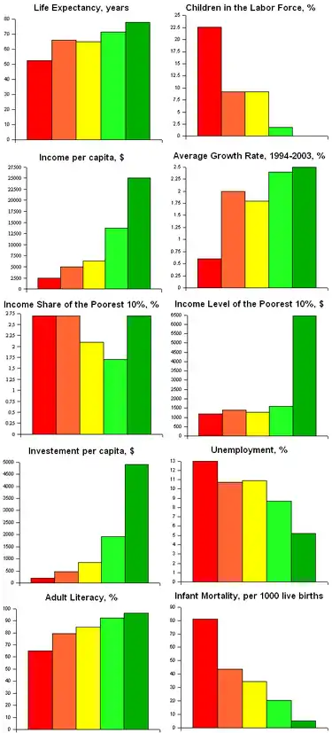 Charts showing economic freedom, as defined in Economic Freedom of the World, and various other indicators. The red bars shows nations with less economic freedom, the green bars those with more.