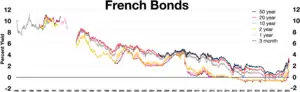In July 2020, during the COVID-19 pandemic, the French government issued 10-years bonds which had negative interest rates, for the first time in its history (which means that investors buying French bonds will pay, rather than receive, interest for owning French sovereign debt).[62]